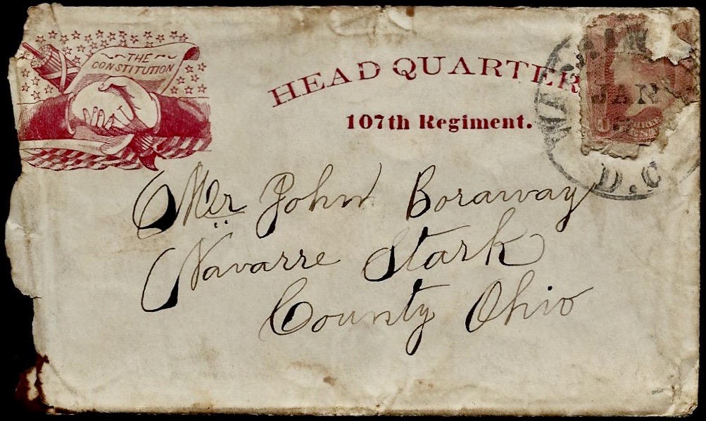 This is one of six letters that were written by Jacob M. Buroway, the son of Isaac Buroway and Mary Hollinger of Navarre, Stark county, Ohio. [Note: there are various spellings of the surname but we have used the name on the family gravestones.] Jacob enlisted in Co. A, 107th Ohio Volunteer Infantry (OVI) — a regiment composed largely of immigrant Germans from Cleveland and Cuyahoga County. Also known as the “5th German Regiment,” it was organized at Camp Cleveland in the summer of 1862 and mustered into federal service on Sept. 9, 1862. The regiment did not “see the elephant” until the Battle of Chancellorsville where they were surprised by Gen. Stonewall Jackson’s flank attack and skedaddled, earning them the ignominious sobriquet, “the Flying Dutchmen.”