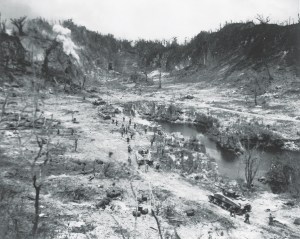 Defending Peleliu was Colonel Kunio Nakagawa with 5,300 troops of the 14th Infantry Division, 1,100 naval infantrymen and some 4,500 other personnel, mostly Korean and Okinawan laborers, to oppose the 17,490 Marines under Maj. Gen. William Rupertus, commander of the 1st Marine Division, who landed on Sept. 15, 1944. After a failed attempt to drive the Marines from the beach, followed by the loss of Peleliu’s airfield the next day, Nakagawa concentrated his forces on Umurbrogol Mountain, exploiting its limestone caves and ridges in a tenacious, ultimately suicidal defense aimed at inflicting maximum casualties on the enemy.