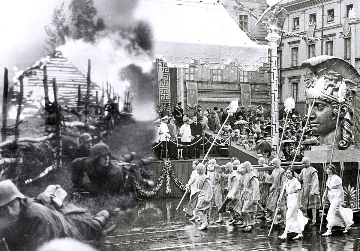 Left: Waffen SS troops, radicalized by the Nazis' cultural superiority campaign, wage a genocidal war on the Eastern Front in 1941. Right: Hitler and Goebbels look on as a float of a Greek goddess passes in the 1939 “Day of German Art” festival. (Polish State Archive / Ullstein Getty Images / HistoryNet photo illustration)