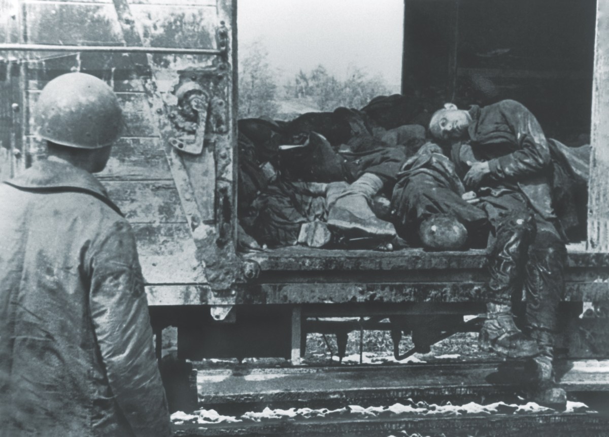 When a 45th Division company under the command of 25-year-old Lieutenant Walsh approached the camp, the men spotted 39 railcars, mostly boxcars and gondolas, parked on a siding. At first glance, the cars appeared to contain piles of dirty clothing, but as the men drew closer, they saw that the soiled laundry was actually the corpses of hundreds of concentration camp inmates—2,310 of them, as it turned out. Some had been shot or beaten, but most had died of starvation. The emaciated bodies shocked these battle-hardened veterans. “Honest,” Lieutenant Cowling wrote to his parents, “their legs and arms were only a couple of inches around and they had no buttocks at all.” Colonel Fellenz, a 28-year-old 42nd Division battalion commander, estimated the bodies weighed only 50-60 pounds each. What haunted these soldiers most, however, were the eyes of the dead. To Private John P. Lee, their death stares seemed to ask the G.I.s: “What took you so long?”