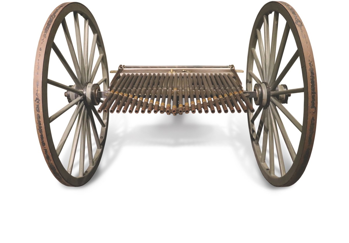 The centerpiece of the weapon consisted of 25 horizontally arrayed barrels that were loaded at the breech. A crew of three worked the gun, opening up a “piano hinge” breech block to admit a strip of .52-caliber brass cartridges, each with a hole in the base. Once the strip was in place, a gunner pulled a lanyard to detonate a single centrally placed percussion cap and discharge the deadly pipe organ. After the initial cartridge discharged, it triggered a chain reaction as the flash jumped to the other rounds until all had been fired.