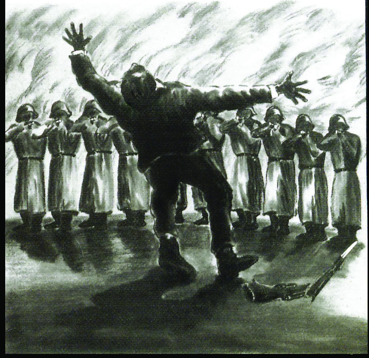 Kusch expressed these last dark hours in stunningly evocative artwork that would be published after the war, including his nightmare of the firing squad that awaited him.