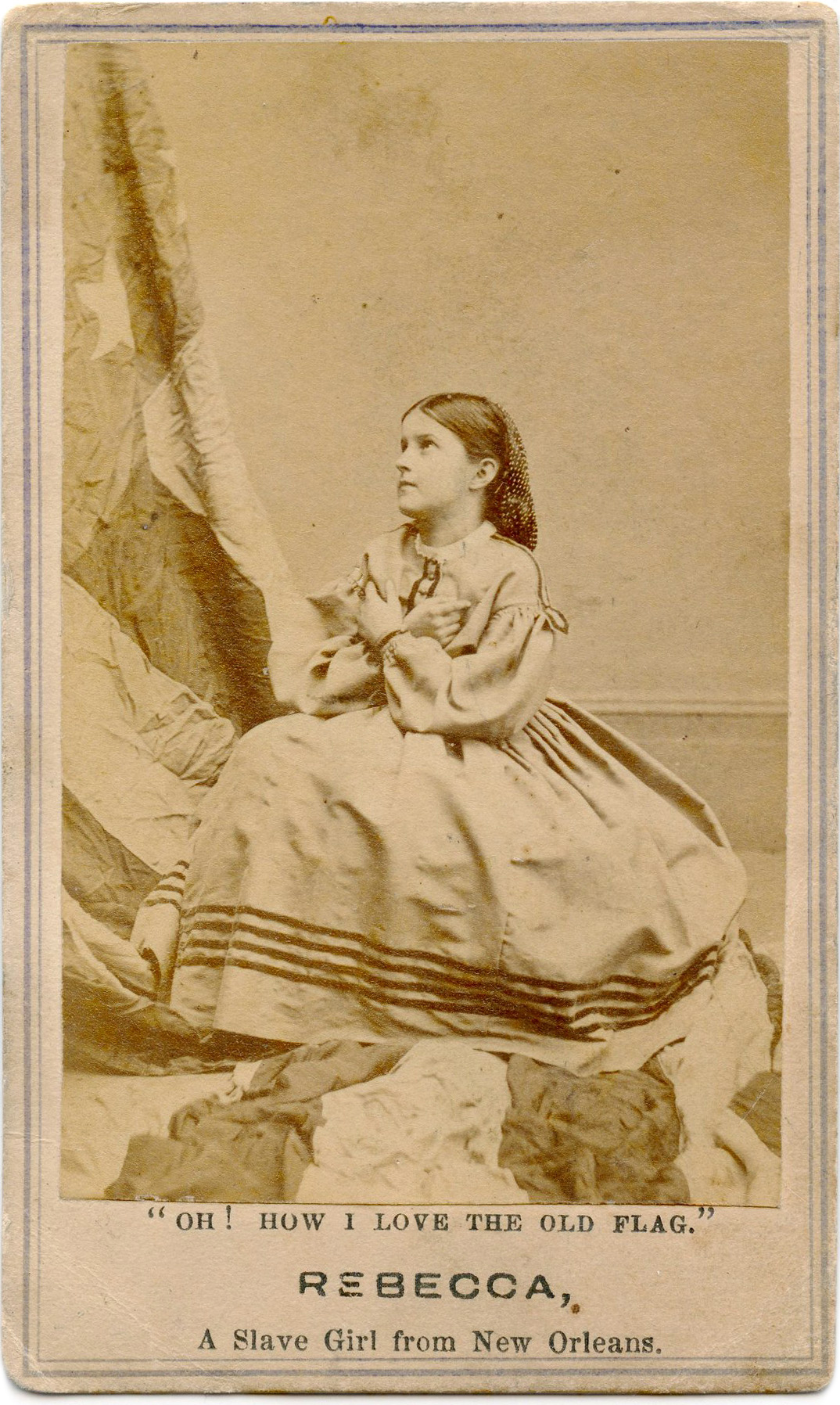 The campaign’s purpose was to raise money to educate former slaves in Louisiana, a state still partially held by the Confederacy. One group portrait, several cartes de visite of pairs of the students, and numerous portraits of each student were made. The emancipated slaves were also photographed with props to imply that the subjects shared the viewers’ values, for example, this one of a young Caucasian-looking girl adoring the American flag. The group photo was also published as a woodcut in Harper’s Weekly in January 1864 and was accompanied by the biographies of the eight emancipated slaves, which served successfully to fan the abolitionist cause.