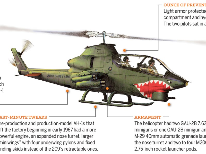 Huey gunships had a nomenclature based on their armament. “Frogs” carried grenade launchers on the helicopter’s nose. “Hogs” or “heavies” carried large rocket pods. “Guns” or “lights” were fitted with various configurations of the fuselage and pod-mounted machine guns, miniguns and smaller rocket launchers.