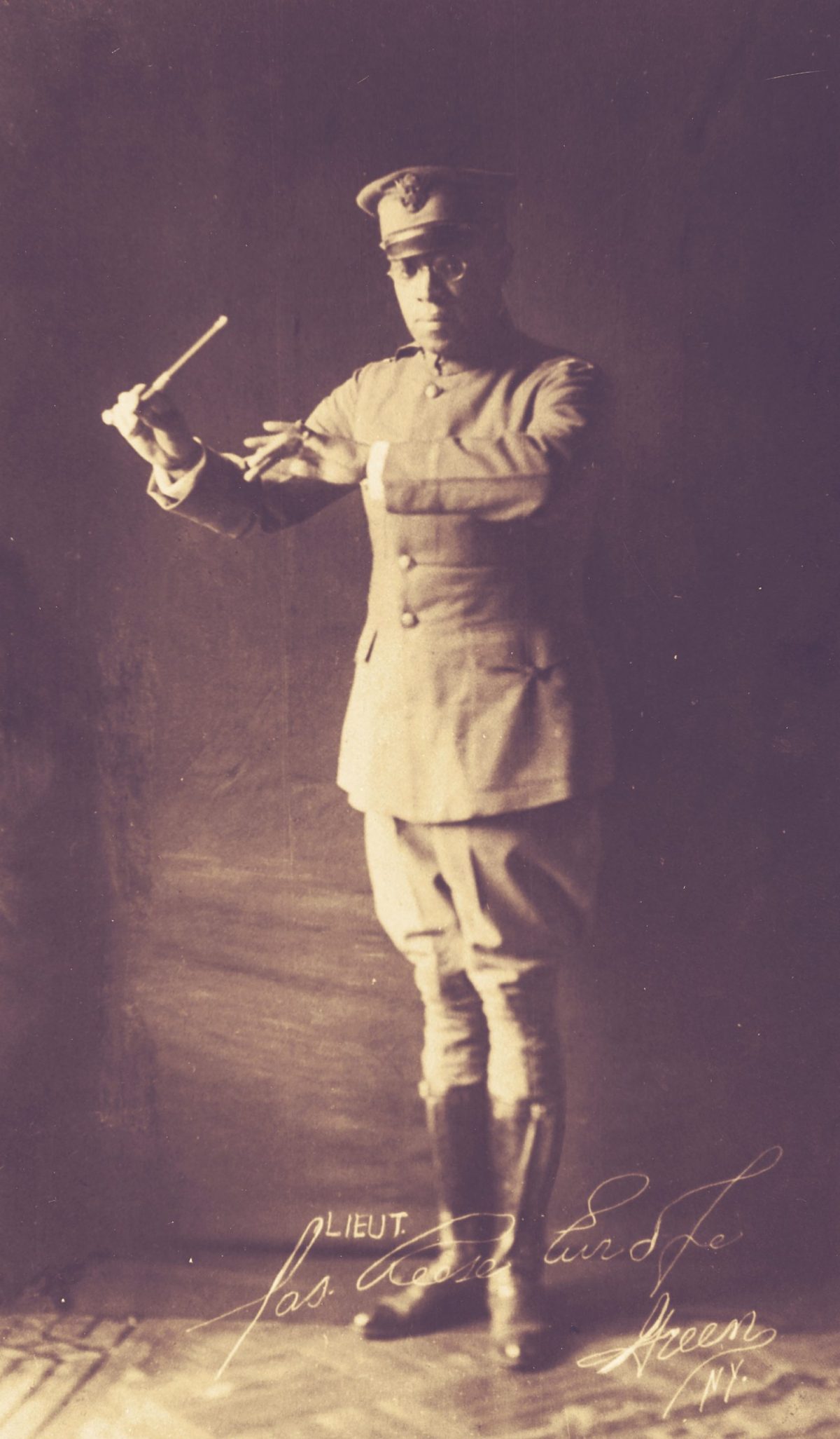 The Great War wrote the James Reese Europe story’s most illustrious chapter. But for the war, he might have been a hit in his namesake continent much earlier—he and his orchestra had a Continental tour with the Castles scheduled until the fighting began on July 28, 1914. Instead, Europe dove into club and private party bookings. In September 1916, he and fellow performer and songwriter Noble Sissle joined the 15th New York Regiment, a unit of the National Guard in Harlem and a real-world variant on the theme of The Shoo-Fly Regiment. New York Governor Charles S. Whitmore had formed the unit at the suggestion of Charles W. Fillmore, a veteran of Spanish-American War service as a Buffalo Soldier. Fillmore served as senior captain under Commander William Hayward, a Caucasian. When Europe, who saw a Harlem-based Guard unit as a step toward equality for African Americans, passed the examination for a commission, he was made a second lieutenant.
