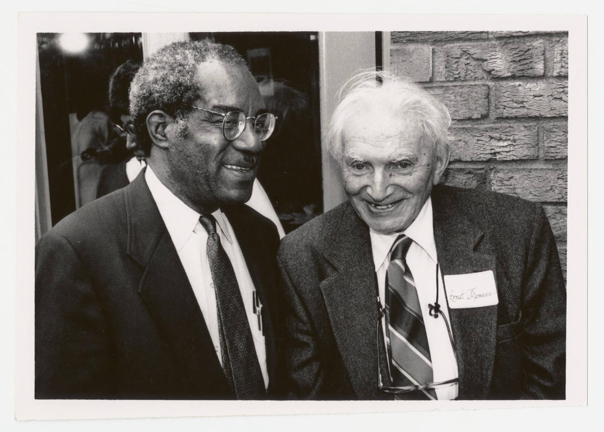 The late Chancellor of North Carolina Central University Julius L. Chambers (left) and former NCCU professor and Jewish scholar Ernst Manasse (right). (James E. Shepard Memorial Library University Archives, Records and History Center, North Carolina Central University )