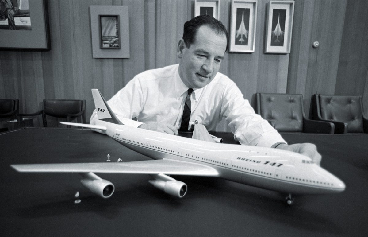 Joe Sutter, “the father of the 747,” studies a model of the Boeing jumbo jet for which he led the design team. The huge airliner was also a huge risk — “the largest financial and technological gamble in the history of aviation,” according to author Simon Winchester. The risk paid off, and the 747 transformed airlines.