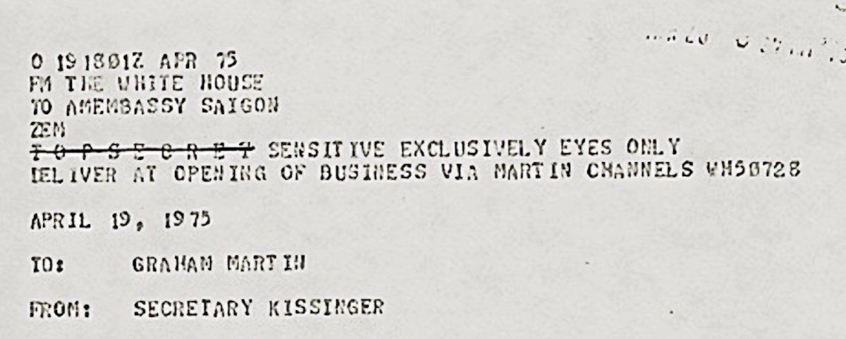 This cable from April 19, 1975, was sent by U.S. Secretary of State Henry Kissinger to Graham Martin, U.S. Ambassador to South Vietnam about the impending evacuation of Saigon. It also contains advice about interactions with President Nguyen Van Thieu of South Vietnam. This very candid document is one of many that have been made available to the public by the National Archives.