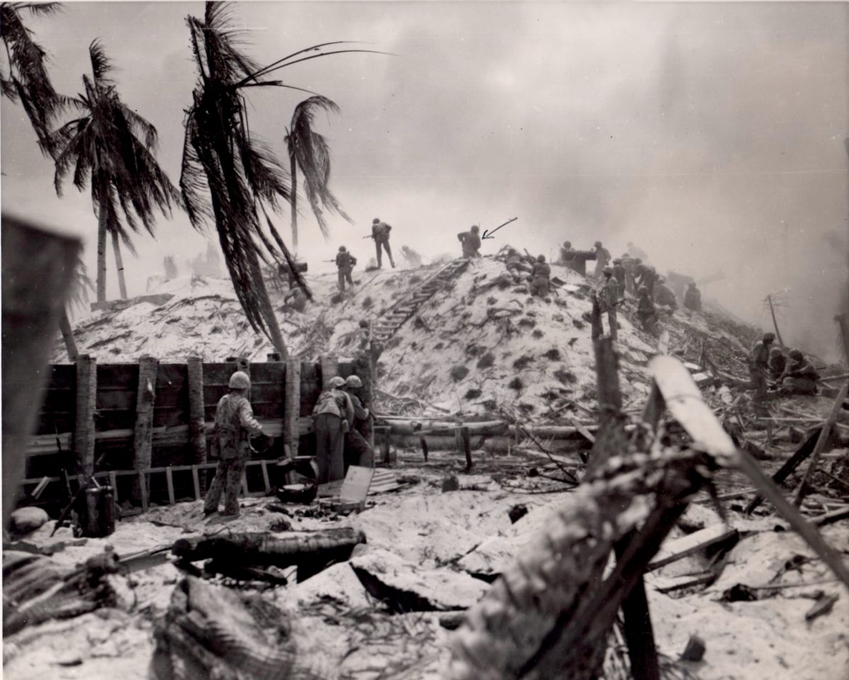 The tiny islet of Betio, part of the Pacific atoll of Tarawa, looks every bit the hellscape it was when this photo was taken on Nov. 22, 1943. The sandy hill hid a Japanese blockhouse that U.S. Marines — following the example of 1st Lt. Alexander Bonnyman Jr., shown at the top of the log stairs — were storming, flamethrowers in hand.