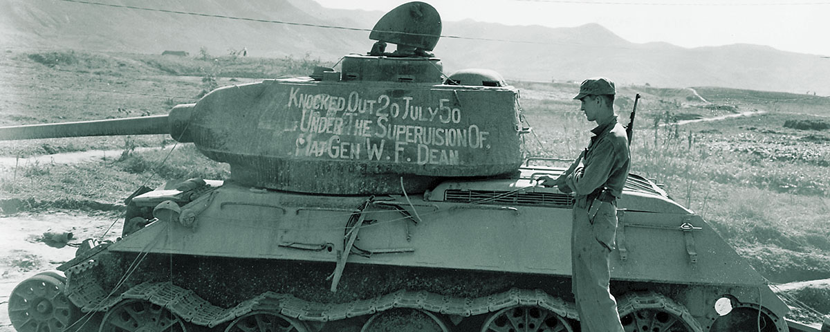 As North Korean tanks rampaged through the streets of Taejon, South Korea, in mid-July 1950, a tall American officer led his unit’s tanks in the destruction of enemy armor and personally took out one tank with a hand grenade. Subsequently separated from his men, he evaded capture for 36 days before being taken prisoner. The officer was Maj. Gen. William Dean, commander of the 24th Infantry Division, and his valor in Taejon earned him the Medal of Honor. Despite his courage and leadership from the front, however, the enemy routed his broken division.