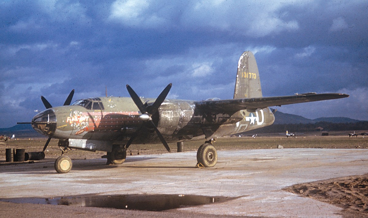 “What a piece of junk,” pilot Lieutenant Sher­man Best, who flew 14 missions in Flak-Bait, is said to have remarked on first seeing the beat-up bomber. With paint chipping everywhere (Marauders lacked a primer coat coming off the line) and numerous “scab patches” over flak damage, it had the appearance of a patchwork quilt. But by the spring of 1945 everyone wanted to serve in the “lucky” bomber. Its final mission was flown by the group commander, his chosen pilot from another squadron and a hand-picked crew.
