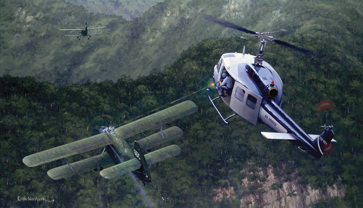 Moore, in his faster but unarmed Bell 212 (a civilian UH-1 Huey), chased the Antonovs as his crewman, flight mechanic Glenn Woods, leaned out the side door and fired an AK-47 assault rifle. Both biplanes crashed into the trees short of the border. One was felled by Woods’ rifle.