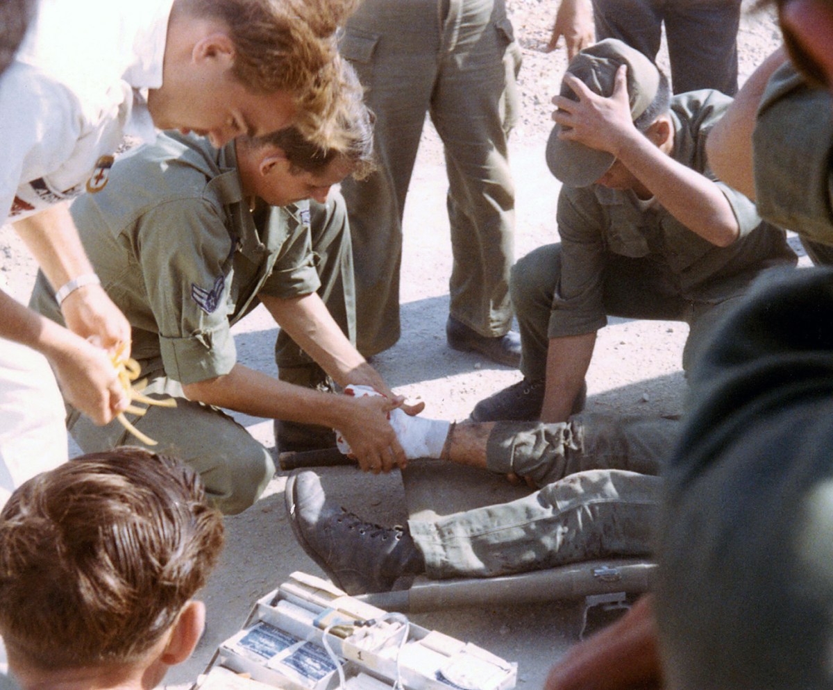In March 1966, an ARVN soldier became stranded in a minefield just outside Bien-Hoa Air Base after tripping a small anti-personnel mine. Part of his foot blew off, leaving him wounded and needing quick medical attention. Getting to the wounded soldier would take some serious thought.