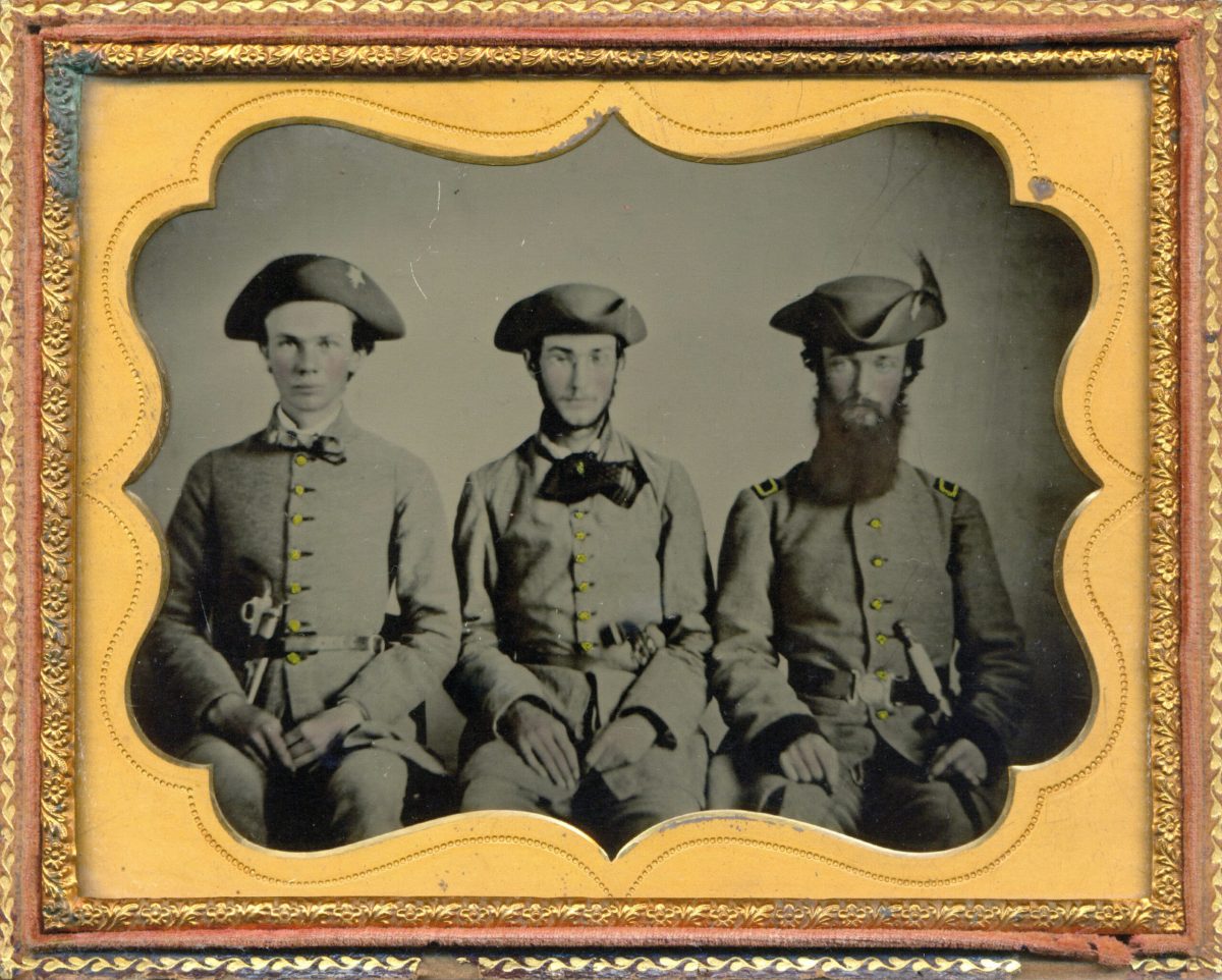 Three Confederate soldiers in the 21st Mississippi Infantry — bearded Captain Nicholas Blackwell sits far right — pose early in the war. All wear tri-corner hats with five-pointed stars, a look favored by many Magnolia State troops.