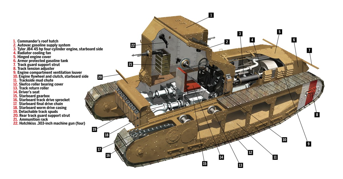 The heavy, lozenge-shaped mechanized juggernaut the British code-named a “tank” had scarcely made its combat debut in September 1916 when engineer William Tritton, while visiting the Somme front, was asked to design a lighter armored vehicle. Working in concert with fellow engineers, Tritton developed a working prototype by February 1917. Dubbed the “Tritton Chaser,” the fighting vehicle was initially fitted with an offset, rotating turret mounting a .303-inch Lewis machine gun. As the design evolved, the rotating turret gave way to an angular, fixed superstructure with gunports covering all four points of the compass. Replacing the Lewis gun were four .303-inch Hotchkiss Mark I machine guns. The resulting Medium Mark A was nicknamed the “Whippet”—a nod to its top speed of 8.3 mph, as compared to the lumbering Mark I tank’s 3.7 mph, though the Whippet’s canine namesake could easily outrun both mechanical monsters.