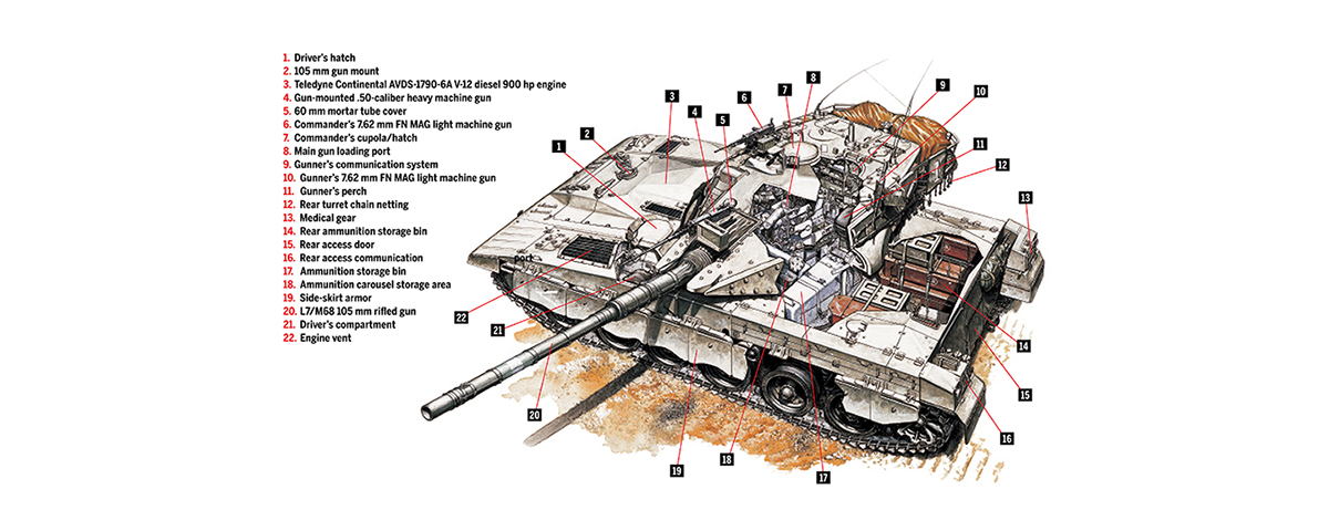 As Israel developed an armored corps, it faced the quandary of acquiring weaponry from an outside world devoid of trustworthy sources. The grim losses it suffered during the 1973 Yom Kippur War—with 1,500 of its more than 2,500 dead being tankers—underscored the dire need for a tank capable of both protecting its crew and taking on the best Israel’s Arab enemies sent against it. Under the direction of Maj. Gen. Yisrael Tal, the Israelis set to work on an indigenous design, virtually every component of which would be produced by Israeli manufacturers. The resulting Merkava (“Chariot”) Mk I debuted in 1979.