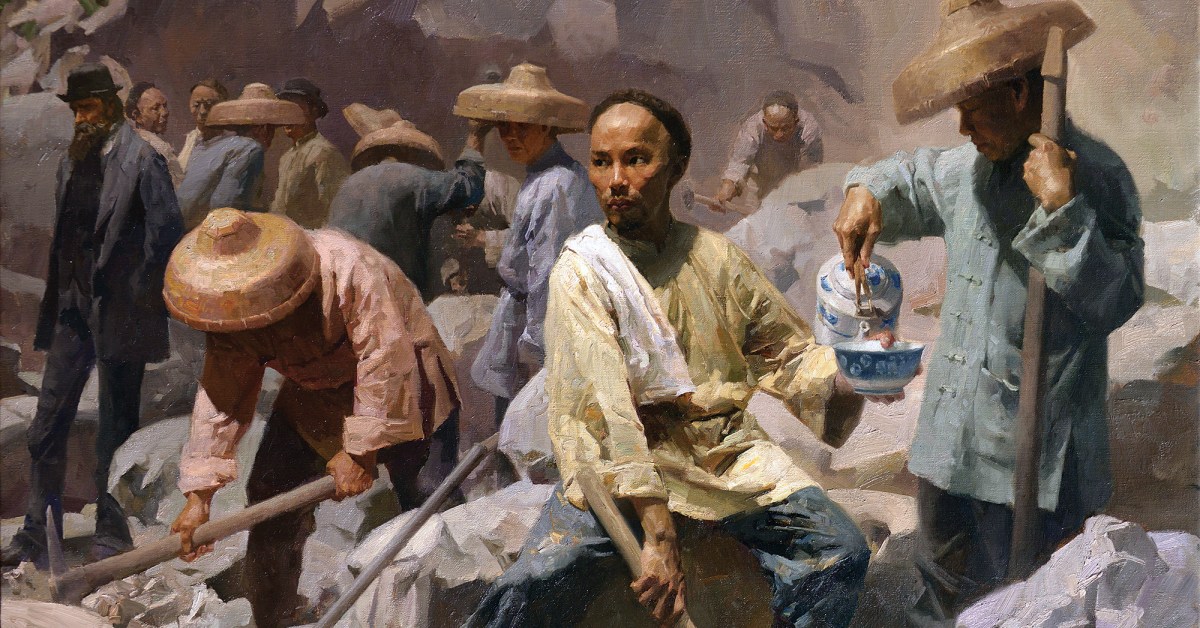 Amid a group of Chinese immigrants blasting and chiseling a path through the rugged Sierra Nevada for the Central Pacific Railroad, one man takes a rare and welcome tea break. The details in Cutting a Path, Sierra Nevada, 1866, a 32-by-36-inch oil on canvas by Mian Situ, bring humanity and realism to the scene. But then, Situ knows this story well.
