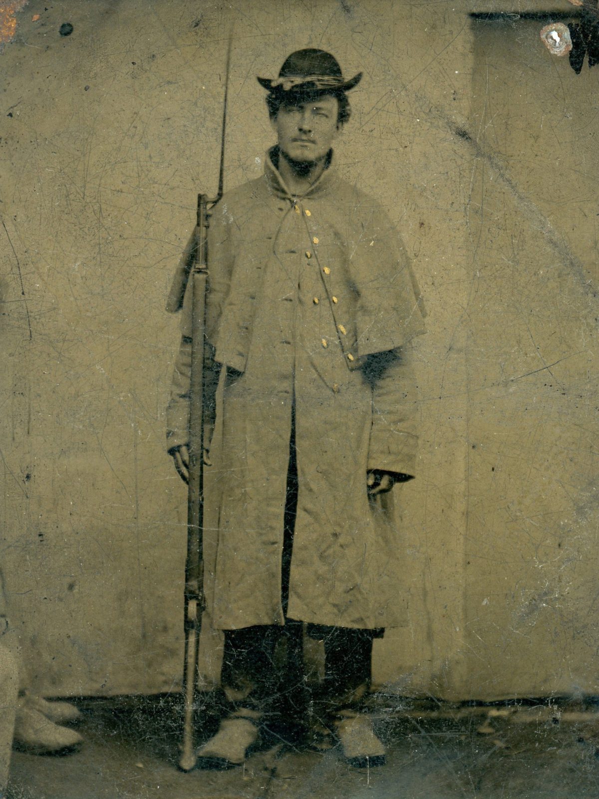 This unidentified Union infantryman exemplifies war weariness. From his rumpled overcoat to his muddy shoes, he casts a picture of someone sick of standing guard during long, cold winter nights. Note the muddy boots at lower left of the next soldier waiting to have his image taken.
