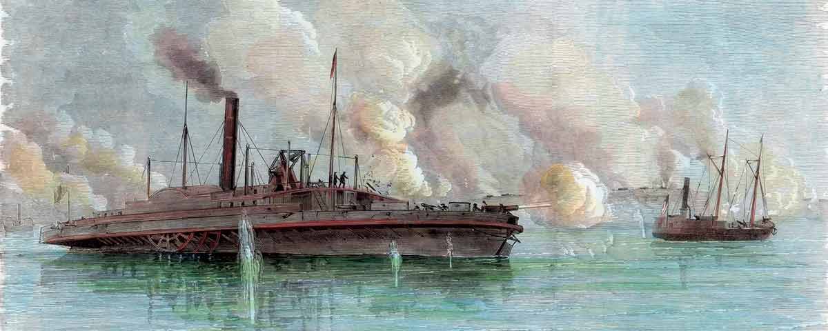 In the other channel, sharpshooters on Clifton delivered a fusillade at the fort when the ship came within a quarter-mile of shore. Undaunted, a Rebel gun crew responded with a round that severed Clifton’s tiller rope, forcing it to run aground. The Federal riflemen gamely continued to fire, but a well-placed shell smashed into Clifton’s boiler, driving the crew and complement of soldiers over the side.