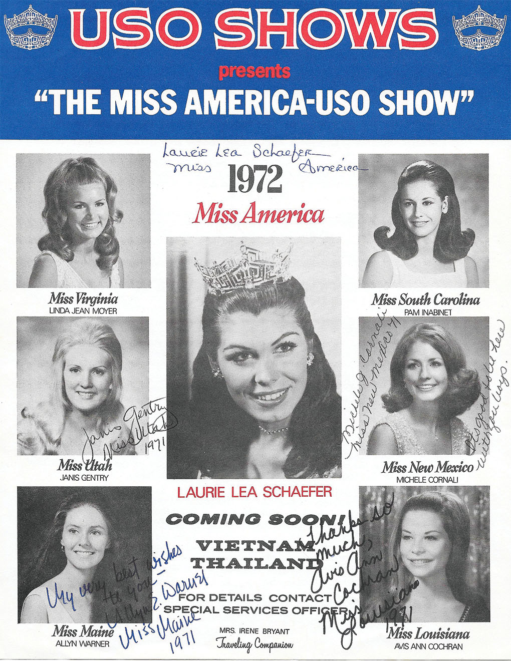 Thank you, Miss Virginia, Miss Utah, Miss Maine, Miss South Carolina, Miss New Mexico, Miss Louisiana and Miss America for giving me a breakfast in Vietnam I shall never forget. V