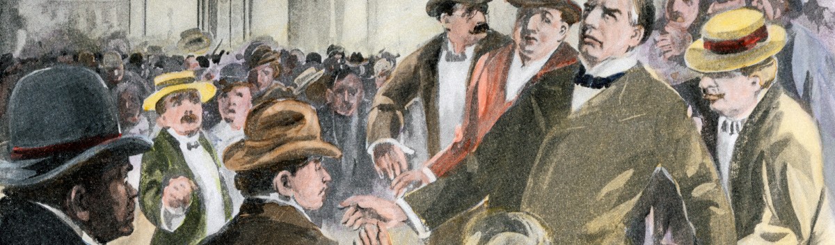A hundred years later, another wish for a president’s death ran in the New York Journal, whose owner, William Randolph Hearst, pioneered use of cartoons, banner headlines, and human-interest reporting. Hearst had political ambitions, presenting himself as a people’s tribune. In the 1896 and 1900 elections he and his papers backed populist Democrat William Jennings Bryan against pro-business Republican William McKinley. The Journal played rough. On January 30, 1900, Kentucky Governor-elect William Goebel was shot; he died four days later. Humorist Ambrose Bierce, a Hearst columnist, marked the event in verse: “The bullet that pierced Goebel’s chest/Cannot be found in all the West/Good reason: it is speeding here/To stretch McKinley on his bier.” A Journal editorial surveyed past assassinations and executions: French revolutionary Jean-Paul Marat, stabbed; Charles I, beheaded; and, of course, Julius Caesar. Those deaths, the Journal said, had good outcomes. “We invite our readers to think over this question,” the editors wrote. “The time devoted to it will not be wasted.”