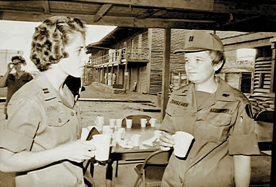 Jurgevich (right) talks with a fellow WAC captain at Long Binh Post near Saigon. (Courtesy of The Army Women’s Foundation)One woman brought an electric skillet for frying eggs, and others brought paper plates and plastic forks for a picnic. You had to keep saying, “Look, the helmet is more important.” Some would bring tape recorders to record noise from rockets. My biggest challenge was keeping everyone in the bunker until the all-clear was given. The women had little fear.