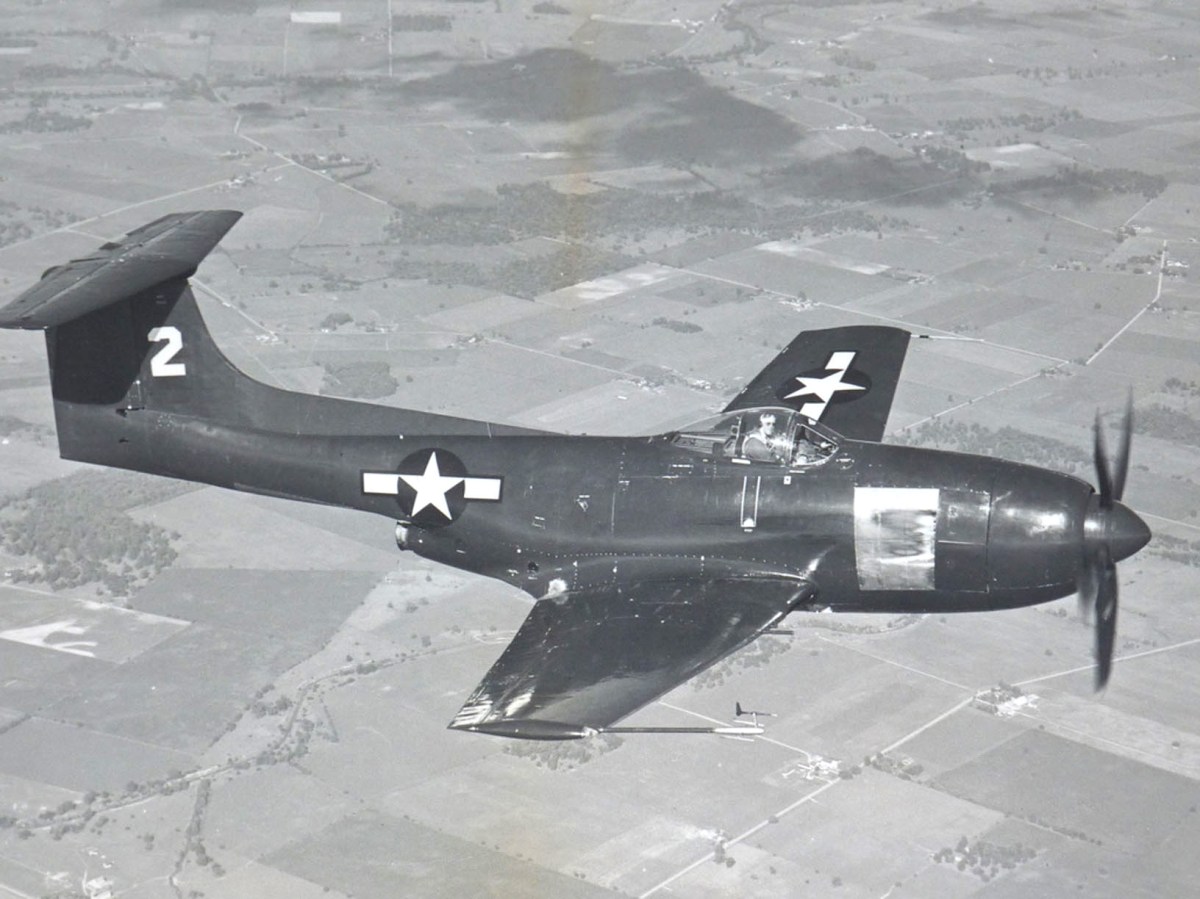Late in World War II piston-engine aircraft reached a peak of performance that even carrier-borne planes could achieve. At the same time, turbojet power had demonstrated its potential, but the earliest jets were unreliable and consumed fuel at a prodigious rate. One short-term transitory means of maintaining a sound military presence in the air was to have the best of both worlds by incorporating both power plants in a single airframe. This seemed particularly attractive to the U.S. Navy, which initially regarded the piston engine’s proven reliability as an essential element in carrier takeoffs and landings. The Navy’s first composite fighter, the Ryan FR-1, first flew in June 1944 and 71 were built. Its 1946 follow-up, the XF2R “Dark Shark,” was less successful, but by then a more established competitor had entered the fray.