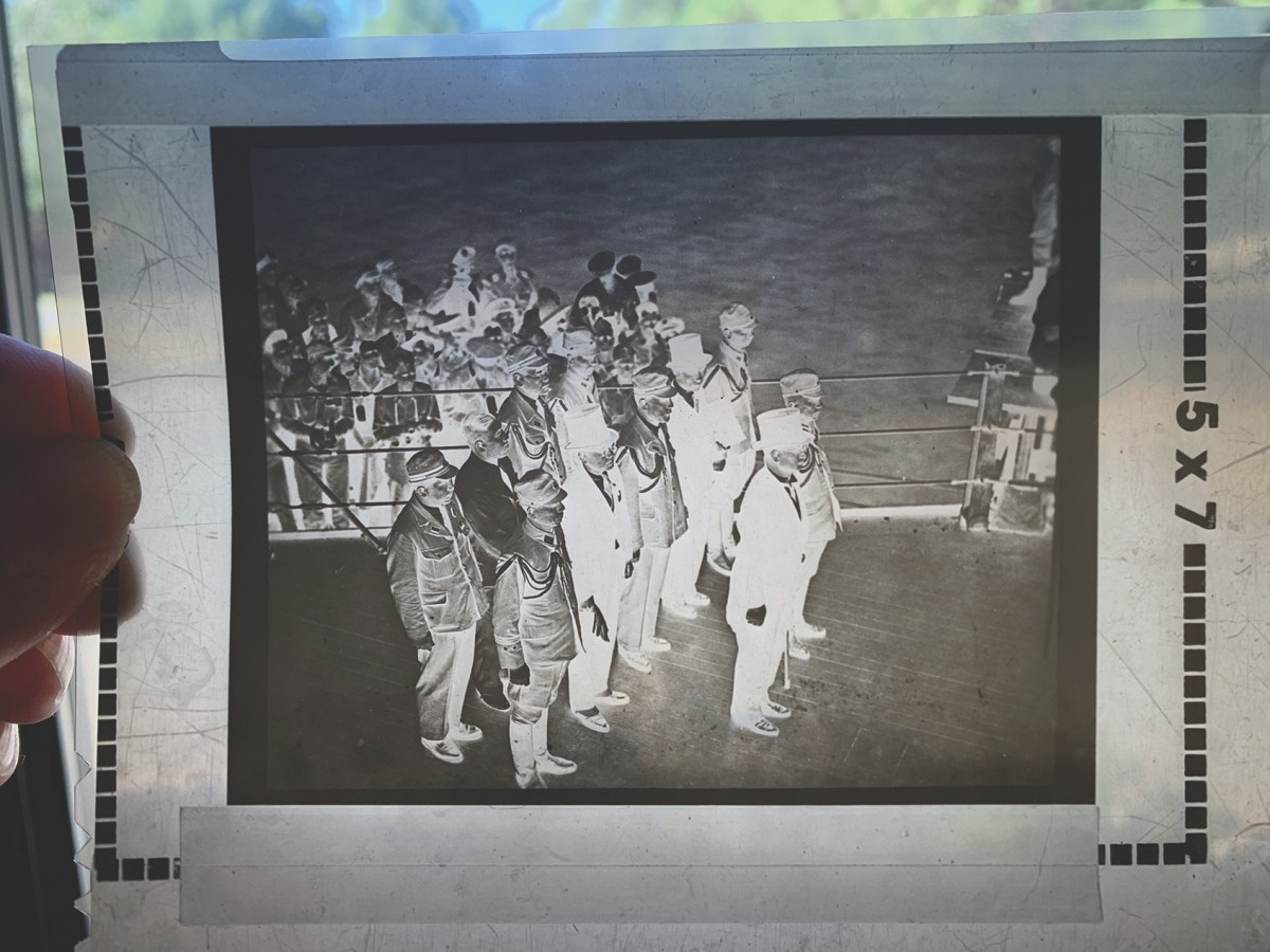While going through my father’s wartime memorabilia, I happened upon a notebook in which he explains that original negatives of images a U.S. Navy photographer took of the Japanese surrender ceremony aboard the USS Missouri were lost, “probably during a gala on ship in New York Harbor.” When the loss was discovered, he—U.S. Navy Photographer’s Mate Third Class Allan Thomas Kimmell—and others working at a photo lab in the Philippines photographed prints to make new negatives. He passed copies of those negatives along to me. I have never heard about the negatives’ loss and am hoping you’ll find it as fascinating as I have and want to learn more.