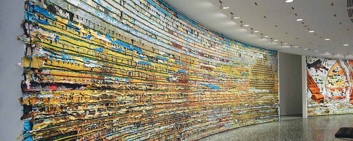 Philippoteaux’s work was and is important in part because it doesn’t romanticize the war. The painting beautifully depicts the Pennsylvania countryside, bathing it in a warm light, but the people in the painting are all marching, killing, bleeding, and dying. It is a difficult tableau. More than 150 years later, as many of us are still processing that painting, that battle, and that war, Los Angeles artist Mark Bradford has unveiled a provocative new work called “Pickett’s Charge,” on view at the Smithsonian’s Hirshhorn Gallery in Washington, D.C., through November 2018. Commissioned specifically for the circular gallery, the artwork uses Philippoteaux’s work as the literal and figurative basis for a series of abstract panels—layered collages of paper and cord and glue, scored and ripped and sliced—that reflect our still-divided times. Sometimes, elements of the original painting can be seen clearly, sometimes not, and that’s the point.