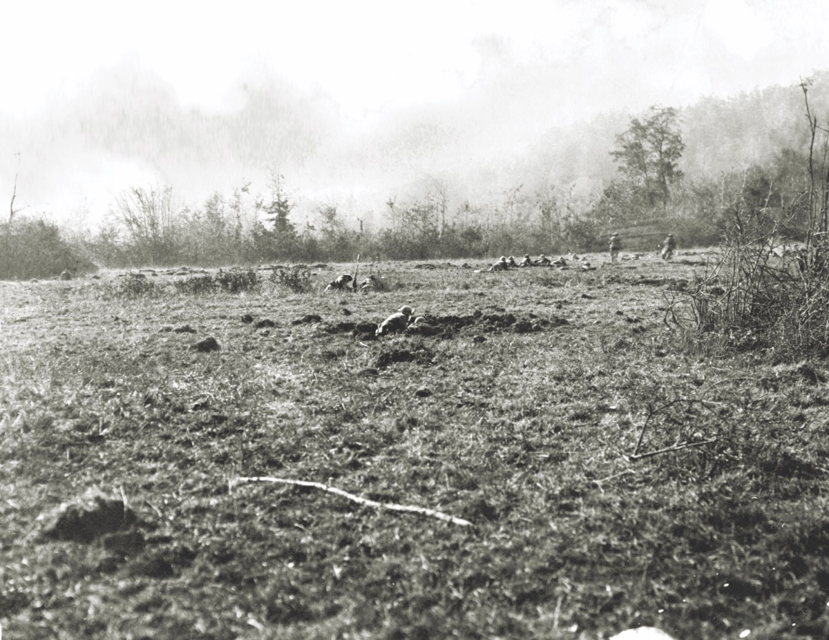 Just before I reached the top of the hill, the gas alarm was given. I put on my mask, but after stumbling over some wire and running into a mule I pulled the mask from my face, deciding to run thru the gassed area. I got a couple of whiffs of the gas—which was mustard gas, but it did not hurt me. When I reached the top of the hill, I started running but had run only a few yards when I heard a shell coming from one of Jerry’s guns. I jumped behind a tree and dropped to my stomach just as the shell exploded within a radius of thirty feet. This shell was gas, and all it did was to throw a lot of dirt on me and cause me to put the mask on and move. This time I got my breath under the tree before resuming the “strategic retreat.” Before I started again, the shelling had become pretty intense, so I hesitated a little longer than I had intended, hating to leave the seeming shelter of the tree. Finally I got up and ran over the longest crest I have ever been on—shrapnel falling all around. Two of our men were hit by shrapnel on this crest.