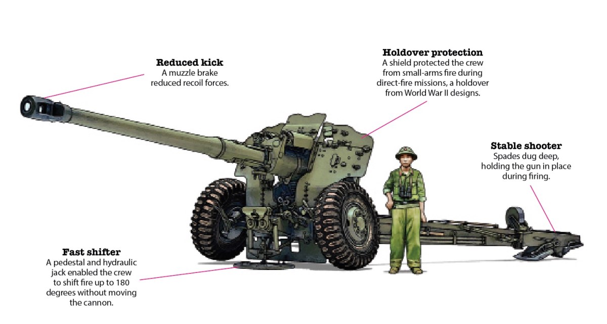 The 122 mm D-74, a towed gun that entered Soviet service in 1955, was the most numerous gun in the NVA’s five independent artillery regiments. The D-74, with a range of 24 kilometers (15 miles), was the third longest-ranged ground artillery piece of the Vietnam War behind the U.S. M107 self-propelled 175 mm gun at 40 kilometers (25 miles) and the Soviet-supplied M-46 130 mm towed gun at 27.5 kilometers (17 miles). D-74 ammunition consisted of metal cartridge containing two propellant charges. The gun had a horizontal sliding-wedge breech block, a hydropneumatic recoil system, a muzzle brake and a split tail carriage.