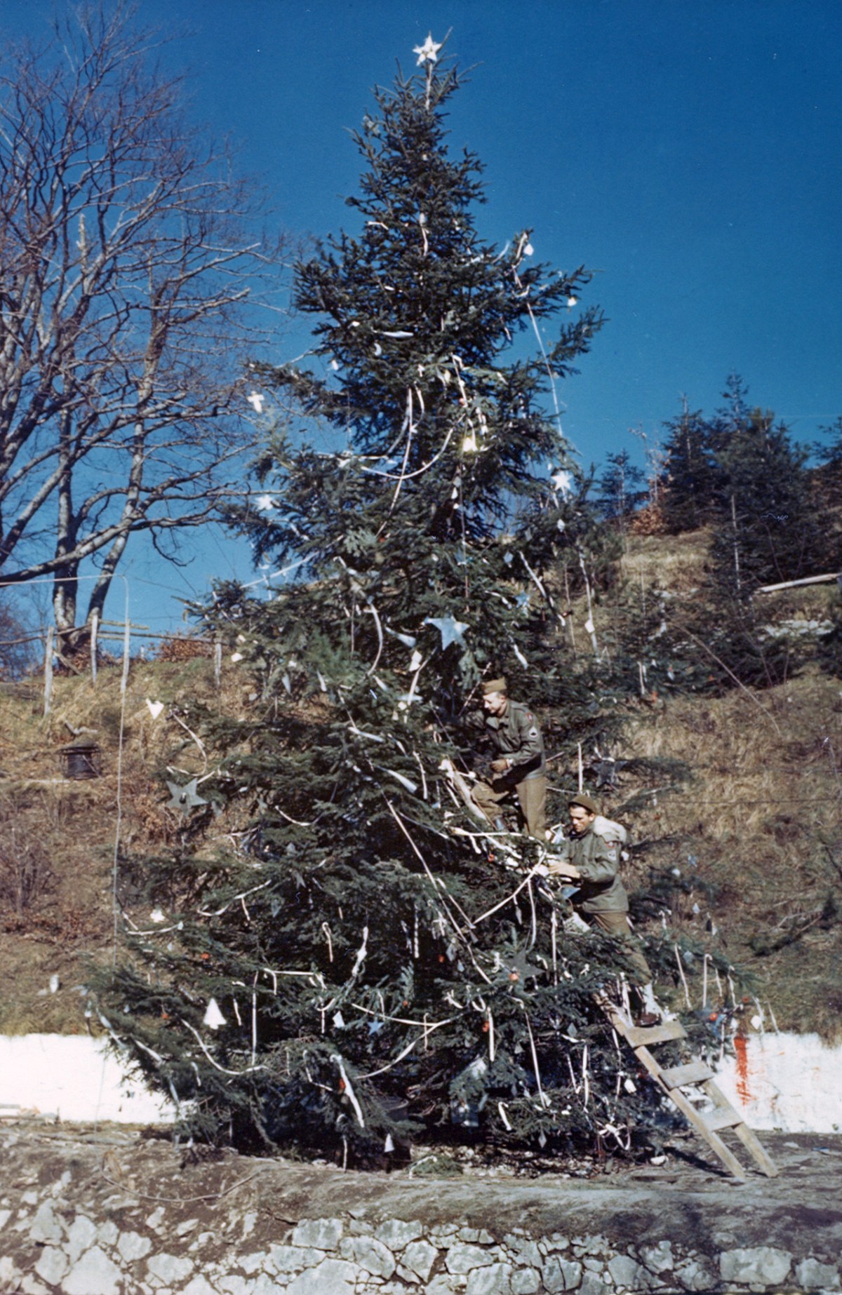 Two members of an American engineering company Staff Sgt. Maurice Welsh of Hartsdale, New York (top) and 1st Sgt. Harold Bloom of River Edge, New Jersey, decorate what was certainly one of the largest trees in Italy in 1944.