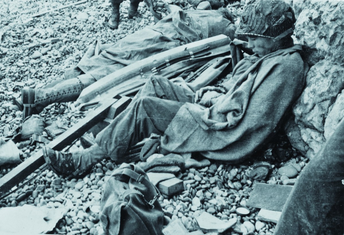There are landing craft barriers at the water’s edge, made in the shape of children’s jacks, and about six feet high. A corpse lies under the nearest one, and other corpses huddle under and around many of the others, trying to find cover where there was none.