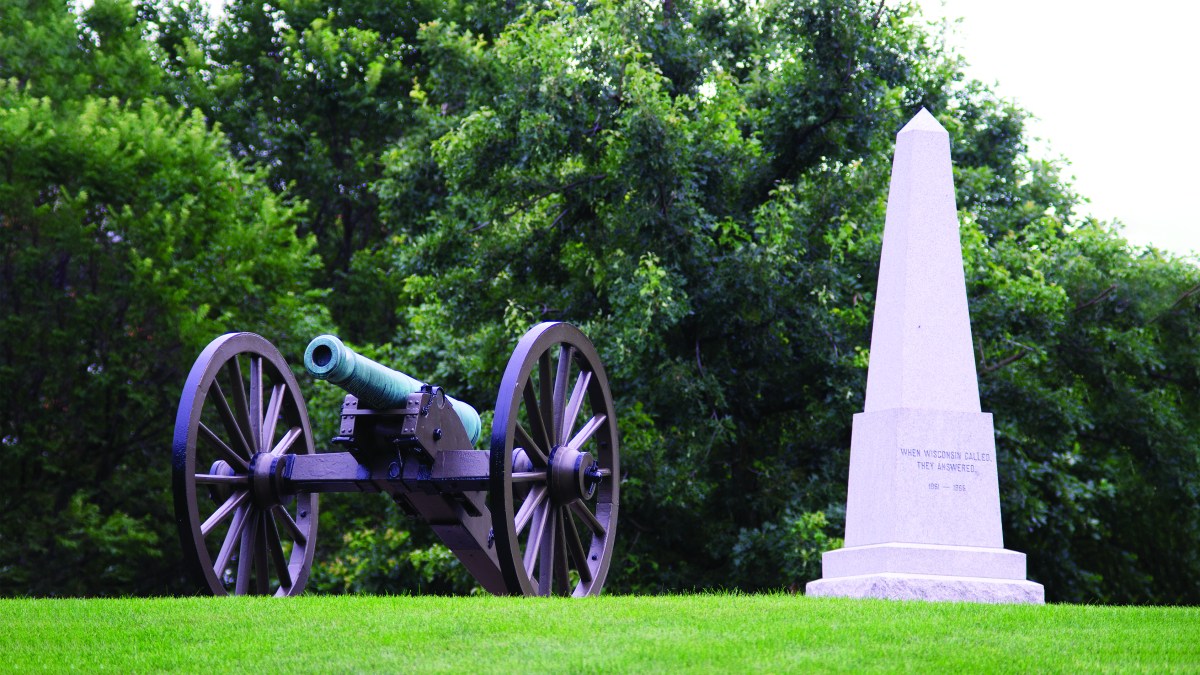 THE STATE OF WISCONSIN was just 12 years young when the Civil War broke out, a patchwork landscape of farmlands, small towns, and urban rise, inhabited by a growing population of settlers from the East and immigrants, mostly German and Irish. Despite its newness to the Union, the state’s allegiance was staunch, and Wisconsin sent more than 91,000 of its sons to fight in the Federal Army. It’s almost impossible to discuss any of the major battles of the war without mentioning Wisconsin’s contribution, especially that of the famed Iron Brigade. At the Battle of Missionary Ridge, 1st Lieutenant Arthur MacArthur Jr. of the 24th Wisconsin rallied the troops, shouting “On, Wisconsin!” as he planted the regimental flag in the middle of Confederate fortifications. His battle cry was adopted as the University of Wisconsin Badgers’ fight song and can be heard during football games at the University’s Camp Randall Stadium, named for the training grounds of nearly 70,000 Wisconsin Civil War soldiers that stood on the site. You can visit a commemorative stone arch there, which also pays homage to another of Wisconsin’s Civil War icons, the bald eagle mascot of the 8th Wisconsin, Old Abe.