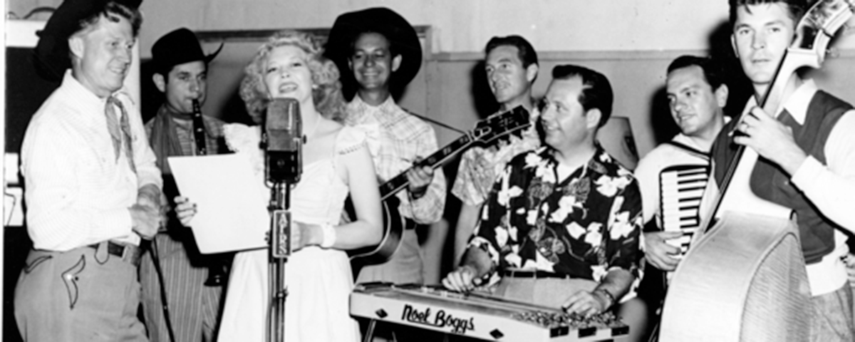 “western swing” band, The Texas Playboys, modeled on outfits led by Benny Goodman, Glenn Miller, and Tommy Dorsey, with fiddles and pedal steel and standard guitars augmenting the horns, woodwinds, and drums. In 1940 Tulsa, Oklahoma-based Wills released “New San Antonio Rose,” which went gold and made him nationwide star. Within the year Crosby had covered the tune, further integrating Wills into the scene. Fresh from her success with der Bingle, Walker had several songs she thought would appeal to Wills when she spotted the Playboys’ bus in LA. The band was in town to film their cinematic debut, Go West Young Lady. Working the phone book, Walker ran down the hotel where the band was staying. Wills saw her and began a fruitful collaboration beginning in 1941 with an extended play disc of Walker’s “Bluebonnet Lane,” “Cherokee Maiden,” “It’s All Your Fault,” and “Dusty Skies.” In 1942 Columbia Pictures contracted with Walker to write 39 songs for eight Wills movies. In time, Walker wrote more than 50 songs for Wills. Bands still perform many of them.