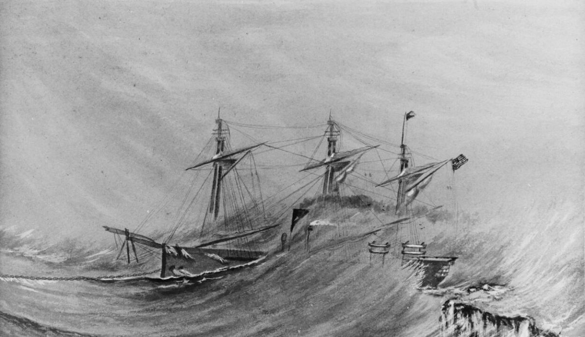 Aboard Trenton men battened hatches, lowered yardarms, unfurled storm staysails, raised steam, and ran out anchors to reduce strain. With all hands on the top deck and in the rigging and Captain Norman von Heldreich Farquhar at the conn, the frigate rode out walls of seawater and pummeling rain. At 7 a.m., according to Rear Admiral Kimberly, sea and wind snapped Trenton’s rudder and carried away the wheel. Only anchors, storm staysails, and the men aloft, serving as human sails, were keeping the ship pointed north. Within the half hour, the sea had smashed holes in the main deck and the gun deck. If no one plugged those breaches, all was lost. Trenton’s crew stuffed the openings with tables, canvas tarps, mattresses, and hammocks as the ship’s anchor cables parted until only one, on the starboard side, was intact.