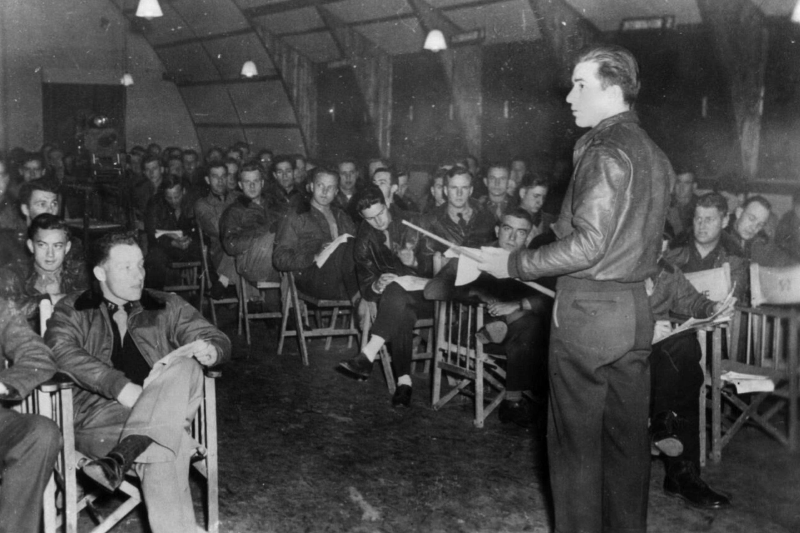 Lyon-Mustang-brief Pilots of Lyon’s fighter group get their mission brief and the “target for today.” (IWM FRE 439)