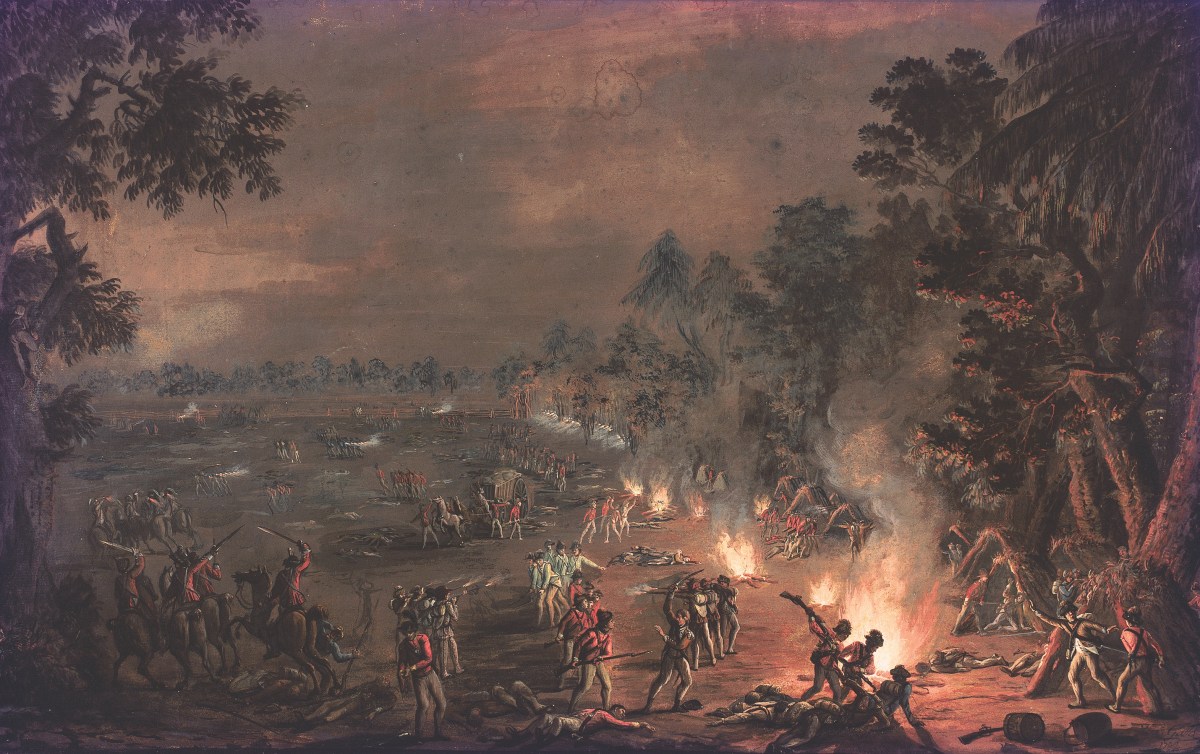 Late in the evening, on September 20, Grey’s men marched west along Swede’s Ford Road to Admiral Warren Tavern, about a mile north of the American camp. To maintain the element of surprise, the British captured any passersby, including a blacksmith they forced to serve as a guide. At 1 a.m. on September 21, Grey ordered his men to fix bayonets and remove the flints from their muskets to preclude any accidental warning shots, a tactic that earned him the nickname “No Flint.” Approaching undetected through the woods, the British overran the American picketts and poured into Wayne’s sleeping camp.