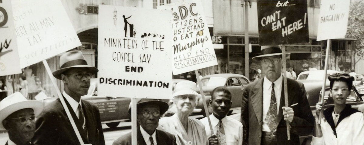 How did she go after Jim Crow? On January 27, 1950, four activists meet at Thompson’s, a cafeteria at 725 14th Street NW, near the White House. Mary Church Terrell is 86. Mount Carmel Baptist Church minister William Jernagin is in his 80s. Their companions are Geneva Brown of the Cafeteria and Restaurant Workers Union and David Scull, a white Quaker.