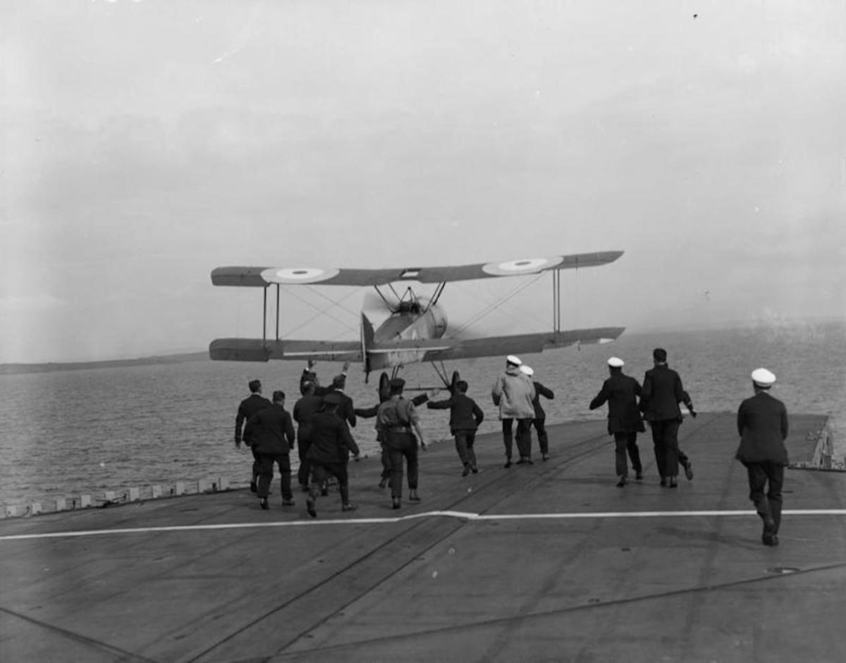 Royal Naval Air Service officer E.H. Dunning became the first pilot to land on the deck of a moving ship. He performed the tricky maneuver by flying his Sopwith Pup alongside the HMS Furious as it steamed at high speed into the wind, then side-slipping inward to the deck. Furious joined the British Royal Navy as an aircraft carrier after being fitted with a primitive flight deck. While the converted ship solved the problem of launching fighter aircraft, recovery was still dangerous and costly, since planes launched from the flight deck were forced to land at sea, where they were often lost. Five days after his successful deck landing, Dunning drowned during another attempt when his aircraft developed mechanical problems and plunged overboard.