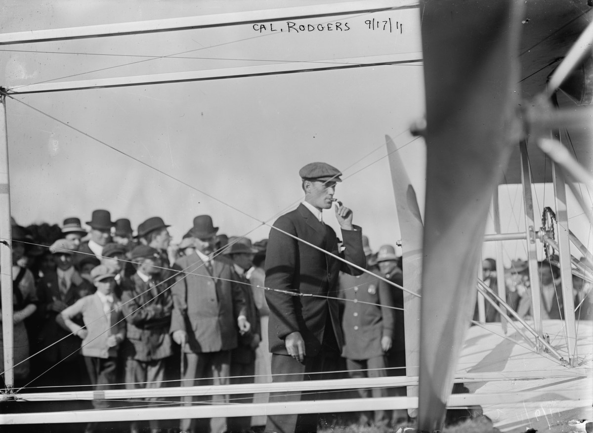 Cigar-smoking Calbraith Perry Rodgers set off from Sheepshead Bay, New York, on the first flight across America on September 17, 1911. Rodgers, seen here looking over his aircraft in front a throng of curious onlookers. He flew the fragile Wright B biplane in pursuit of a $50,000 prize offered to the first person to make a transcontinental flight in 30 days or less. Rodgers failed to win the prize because his 4,321-mile flight took 84 days–of which only 3 days, 10 hours and 4 minutes was actual flying time! By the time he landed at Long Beach, California, on November 5, Rodgers had made 70 crash landings, suffered numerous minor injuries and had rebuilt his Vin Fiz so completely that only one strut and the rudder were its original equipment.