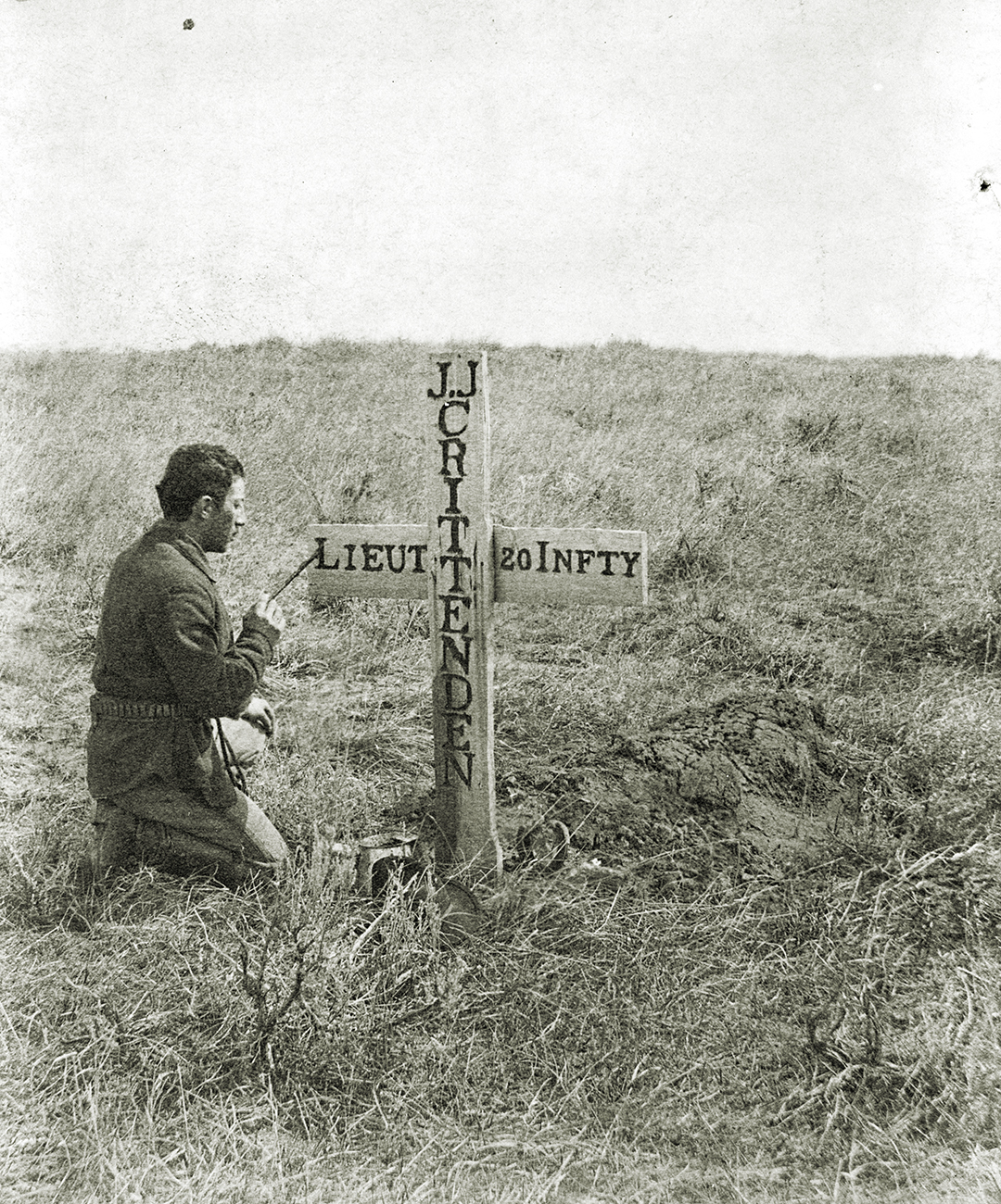 That spring, less than three years after waves of Sioux, Northern Cheyenne and Arapaho warriors wiped out Lt. Col. George Armstrong Custer and 267 men of his command, Sanderson was sent to the Little Bighorn with orders to secure all human bones atop Last Stand Hill and mark the mass grave with a pyramid of stones. While Sanderson was there, his men also placed wooden markers on the known burial mounds of individual soldiers. There to record their efforts was Yankton, Dakota Territory, photographer Stanley J. Morrow, whose image above captures a member of the burial party putting the finishing touches on a marker to 2nd Lt. J.J. Crittenden III.