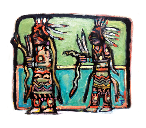 The kisi is large enough to accommodate the gatherer, who crawls inside with all the snakes. He hands a large snake, probably a rattlesnake, to the designated carrier. That dancer clenches the writhing snake between his teeth and stands upright. The third dancer takes a position behind him and slightly to the right. He puts his left hand on the carrier’s left shoulder, and in his right hand he wields what is called a snake whip—actually just a short wooden rod with two attached eagle feathers. His task is to stroke the snake with the feathers to keep it calm.