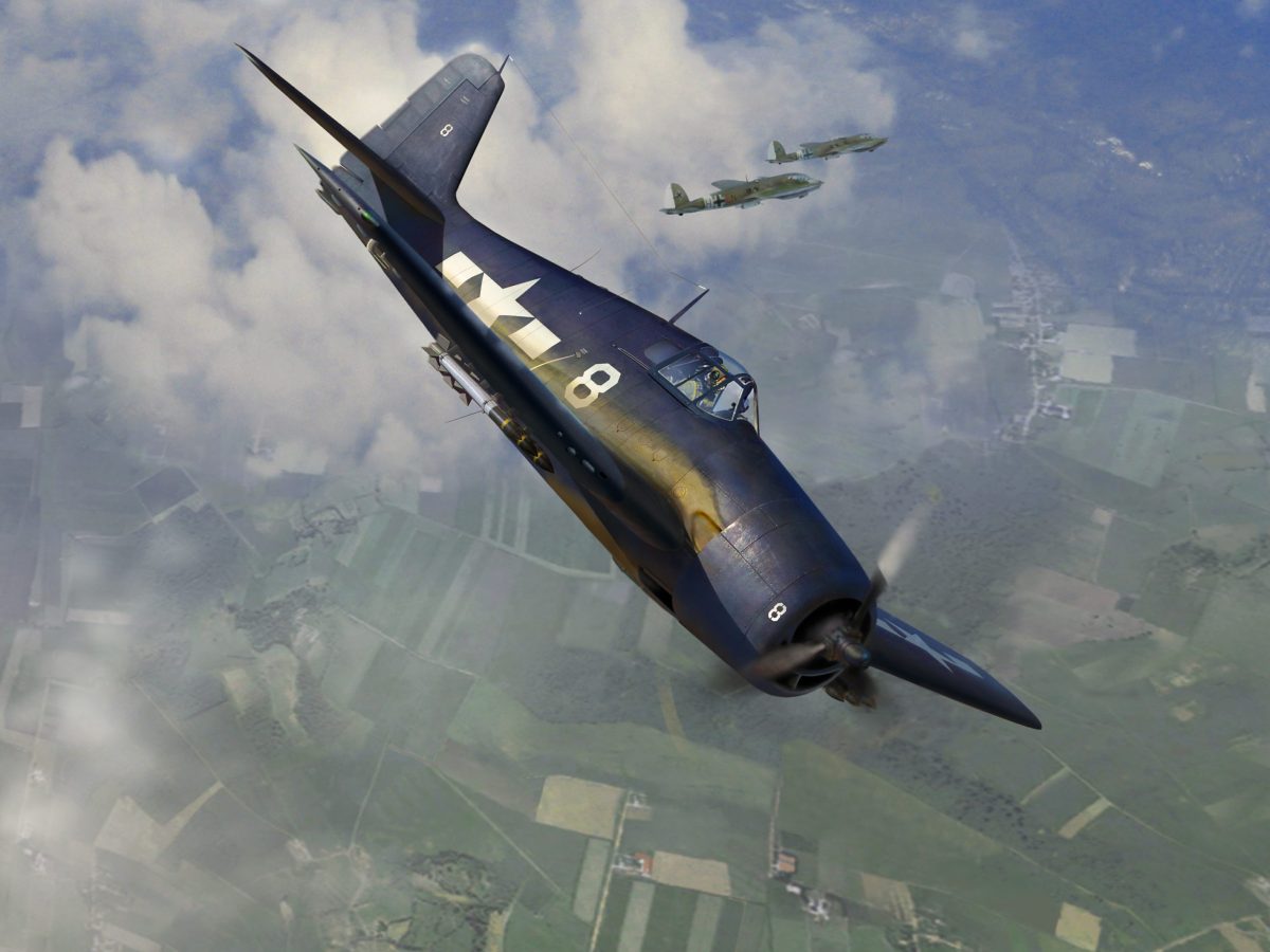 Four Grumman F6F-5 Hellcats swept in from the sea, hunting enemy aircraft attempting to get out from under the U.S. Navy’s aerial umbrella. Heading inland, the fighter leader spotted two twin-engine bombers bearing enemy markings on their wings.