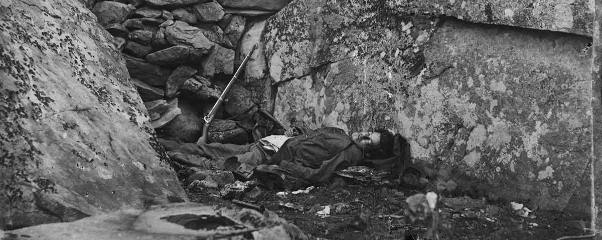 A Confederate soldier, his youthful face turned toward the viewer, lies behind a stone wall built between two boulders in Gettysburg’s notorious Devil’s Den.