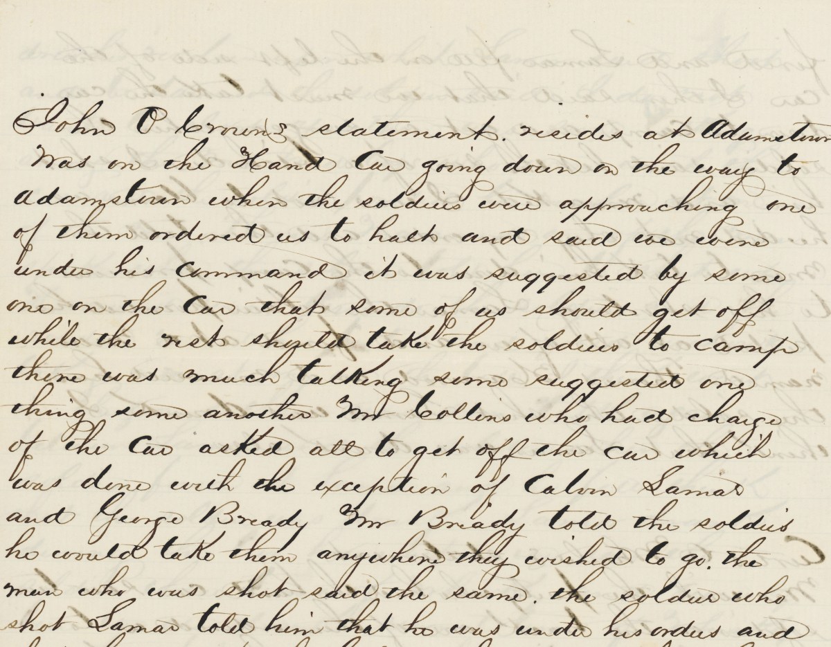 The soldier ordered [us] to stop and take his party to camp. All of our party got off the car excepting Calvin Lamar & myself. One of the soldiers said he was a Sergeant. He had two stripes on his arm, said we must obey his orders. When the soldier (the Sergeant) ordered us to halt he drew his pistol and threatened to shoot us if we did not obey him. I told him I was ready to obey him. He threatened us again and leveled his pistol, firing at me then at Lamar. Lamar said shoot and be damned. The soldier then fired on Lamar and Lamar fell to the ground. When our men first got off the car the Sergeant threatened to shoot unless they stopped.