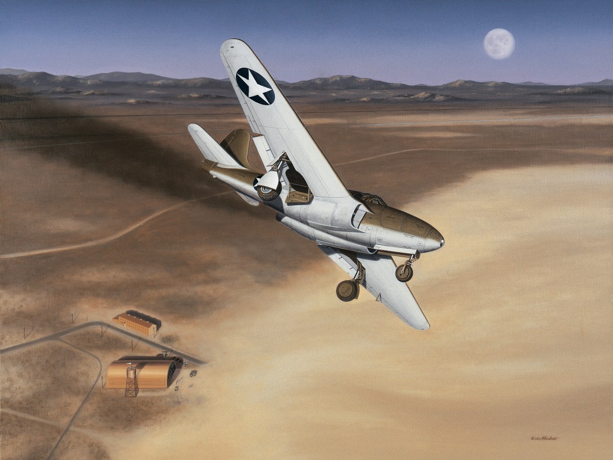 The XP-80 first flew in January 1944, from Muroc Army Airfield. Within five minutes, test pilot Milo Burcham was back on the ground, spooked by the sensitivity of the controls. “You’ve got a 15-to-1 [aileron] boost and a hot ship that’s naturally sensitive,” Johnson told him. “Maybe you were overcontrolling.” Mollified, Burcham tried again and on his second flight had Lulu Belle up to an unprecedented 490 mph. Lulu Belle would soon notch a speed of 502 mph, making it the first U.S. aircraft to exceed 500 in level flight.