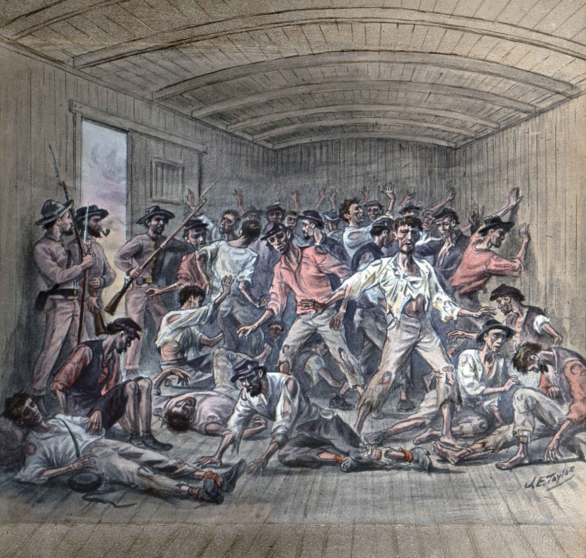 In 1902, seven years before his death at age 66, Union veteran Ezra H. Ripple penned a memoir of his prison life for his “wife and children with no expectation of using it beyond the walls of our home,” as he stated in the introduction. Fortunately, however, that memoir found its way to publication in 1996 as Dancing Along the Deadline: The Andersonville Memoir of a Prisoner of the Confederacy, edited by Mark A. Snell. In the memoir, Ripple chronicled his life as a soldier in the 52nd Pennsylvania Infantry. His regiment was involved in the siege to capture Charleston, S.C., and on July 3, 1864, the 52nd participated in an attack on Fort Johnson, an earthwork stronghold on the northern edge of James Island that guarded the approaches to the Ashley River and Charleston Harbor. Although the Keystone troops broke into the fort, a Confederate counterattack drove them out and captured 135 men of the 52nd, including Private Ripple. He was sent to the prison at Andersonville, Ga., for two months, then to the prison at Florence, S.C., in October 1864 for seven months. Ripple survived, and went on to a successful postwar career in business and politics, moving to Scranton, Pa., and eventually becoming mayor of that city in 1886. But he never left the war behind. Ripple commissioned noted Civil War artist James E. Taylor to create sketches of his prison life, and later had those illustrations transferred to glass plates and colorized as magic lantern plates, or slides, so he could give talks at G.A.R. meetings and public gatherings about his months of grueling incarceration. The following examples of the original slides, held at Scranton’s Lackawanna Historical Society, provide a flavor of Ezra Ripple’s harsh time in Confederate prisons.