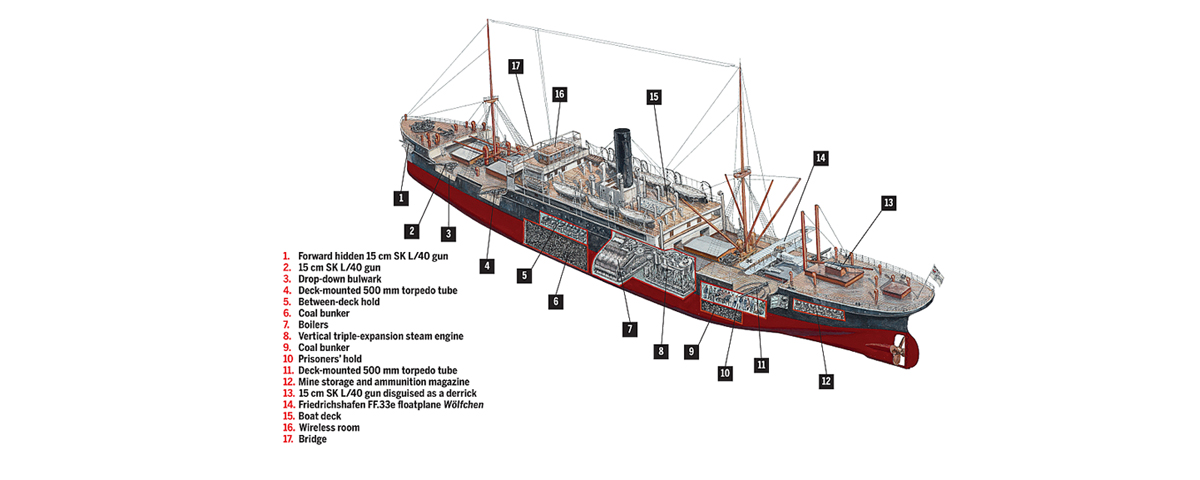 By the time the merchant raider returned to Kiel on Feb. 24, 1918, it had captured or sunk 14 ships, while its mines had sunk another 13. It had also completed the longest voyage of any German raider. Nerger was awarded Prussia’s Pour le Mérite. After the war Germany ceded Wolf to France, which operated it as SS Antinous until 1931, when the ship was scrapped. MH