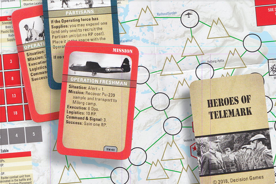 The Basics: Heroes of Telemark is a card-driven game for one. Assuming leadership of a special operations team, the player infiltrates enemy lines in Norway’s Telemark region to destroy resources intended for the German nuclear research program. The player is tasked with recruiting and equipping a small team of spies with limited weapons and equipment, as all missions require transportation via parachute or glider. Stealth, speed, and surprise are paramount.